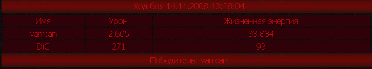 | Ход боя 10.11.2008 17:25:32Имя Урон Жизненная энергия Red42 3.836 68.577 Assistent_2557 390 54.724 Готово