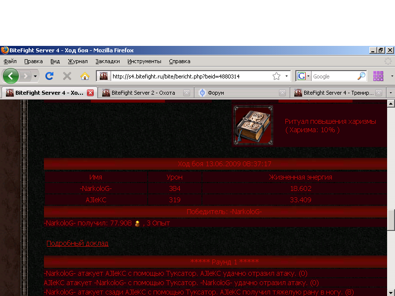 | http://bitefight.shahterov.net/index.p....f8dd493 Ход боя 02.05.2009 17:29:03Имя Урон Жизненная энергия TRAVMATOLOG. 352 3.739 .DrIQ. 313 2.403 Победитель: TRAVMATOLOG. TRAVMATOLOG. получил: 32.009 добавил. Auburn