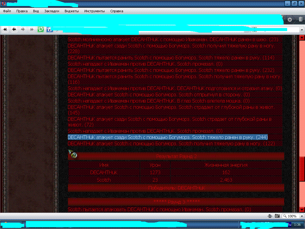 | Обновил тут... Ход боя 20.12.2008 20:03:45 Имя Урон Жизненная энергия -Soldat- 7.293 39.584 AERO_RUS 0 32.108 Победитель: -Soldat- -Soldat- получил: 0 Gold http://bitefight.shahterov.net/index.p....a36f774 Вижу, уже и зелье силы в ход пошло)) Добавил, Каттер.