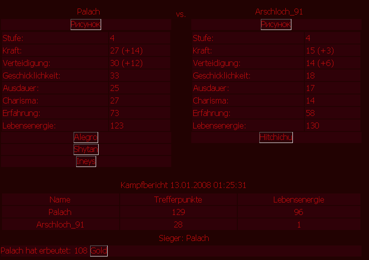 | Deprived [Teni] Stufe: 2 Kraft: 17 (+7) Verteidigung: 18 (+8) Geschicklichkeit: 21 Ausdauer: 15 Charisma: 13 Erfahrung: 5 Lebensenergie: 105 vs. Cricket [asdasdf] Stufe: 1 Kraft: 5 Verteidigung: 5 Geschicklichkeit: 5 Ausdauer: 5 Charisma: 5 Erfahrung: 2 Lebensenergie: 100 Добавлено (23.01.2008, 11:05) --------------------------------------------- урла на перса Правильный копипаст лога боя выглядит вот так: Kampfbericht 22.01.2008 00:26:19 Name Trefferpunkte Lebensenergie Ze_Side 176 180 liebestoeterin 9 1 Sieger: Ze_Side Зачем мне статы, мне результат нужен. Вот поставлю тебе 92 урона из-за невнимательности и отсутствия лога, откуда можно циферку скопировать и ты будетшь морально страдать. И еще.. *бьёццо головой апклаву* неужели так сложно запомнить, что http://s13.bitefight.de/bite....p=33644 - это неправильная ссылка?! Я через одно сообщение всем правлю ссылку и об этом говорю! Я даже каждый раз оставляю ссылку на правила - там об этом написано!!!!! И не только об этом... вообще очень полезная тема. Короче говоря - я не буду добавлять рекорды пока они не будут правильно оформлены. Все Поддерживаю.