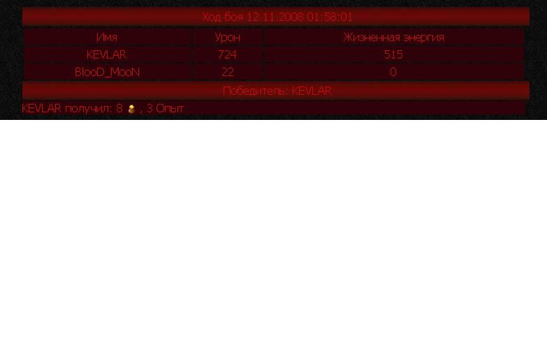 | И сразу: Ход боя 12.11.2008 01:58:01Имя Урон Жизненная энергия KEVLAR 724 515 BlooD_MooN 22 0 Победитель: KEVLAR KEVLAR получил: 8 , 3 Опыт http://s1.bitefight.ru/bite/player.php?p=122509